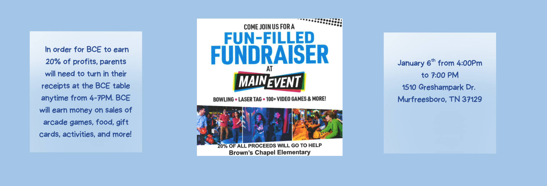 Our next Spirit Night will be on Tuesday, January 6th at Main Event from 4:00 PM-7:00 PM. In order for BCE to earn 20% of profits, parents will need to turn in their receipts at the BCE table anytime from 4-7PM.