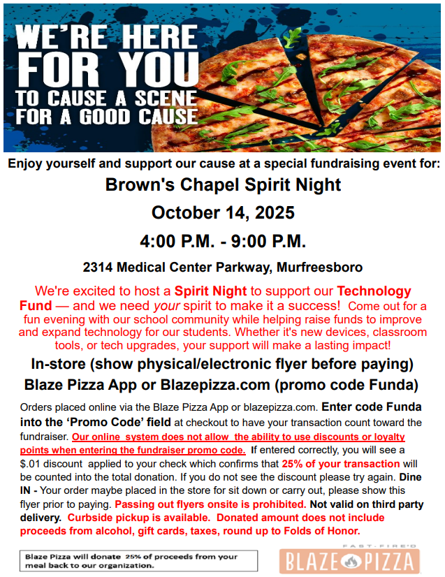Brown's Chapel is excited to announce we will have a BCE Spirit Night at Blaze Pizza on Tuesday, October 14 from 4:00-9:00 PM. This special fundraiser night will benefit our Technology Fund, with 25% of the proceeds of your meal graciously donated to our school. It will be a fun way to support our students and enjoy some delicious pizza! Please be sure to show the flyer (an electronic or physical copy) at checkout, or if ordering online, enter code Funda into the "Promo code" field so your transaction will count toward the fundraiser. Feel free to share this with your friends and family! We hope to see you there!